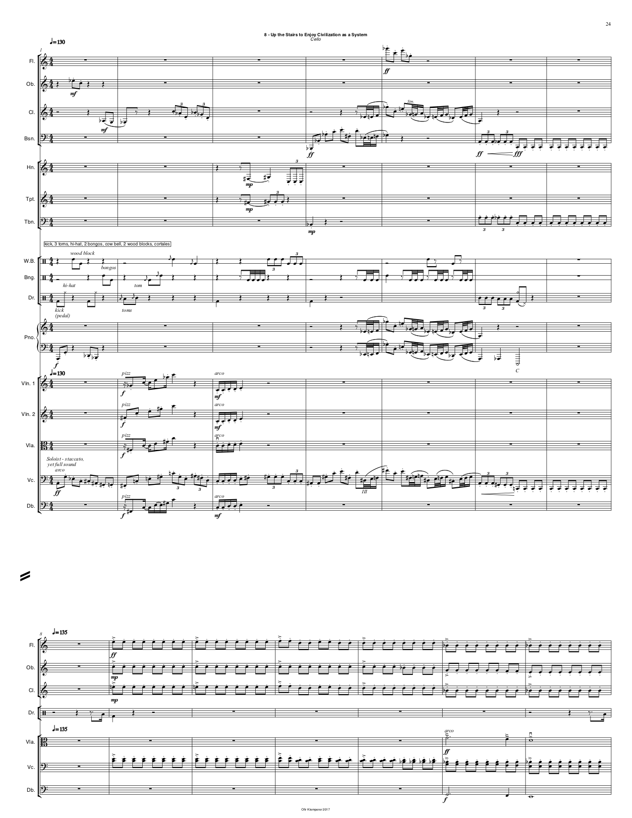 For flute and piccolo (1), clarinet and bass clarinet (1), bassoon, horn, trumpet, trombone, percussion, piano, violin1, violin2, viola, cello, double bass, live electronics (not tape)
